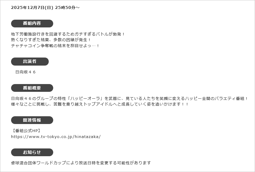 【日向坂46】ひなあいの放送時間、確定 2025/12/7 日向坂46まとめ速報 " " 引用元:https://fate.5ch.net/test/read.cgi/hinatazaka46/1765109546 813:日向坂46まとめ速報 2025/12/07(日) 22:21:04.94 ID:O2oWdRip0 ひなあい1時50分から 続きを読む Source: 日向坂46まとめ速報