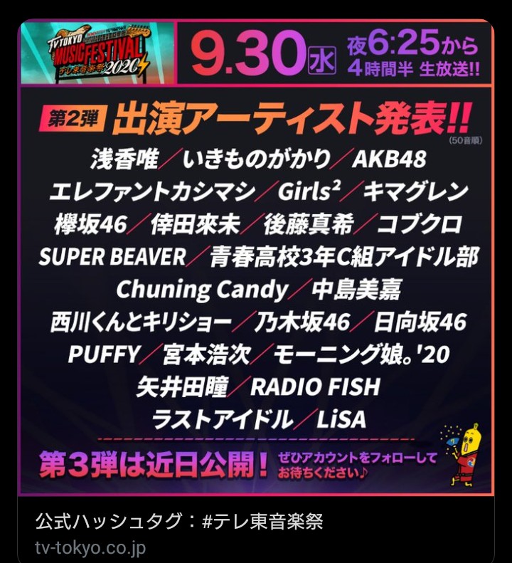 9/30テレ東音楽祭に日向坂が出演!My fansをライブ披露きたー!! 2020/9/17 日向坂46で恋したい! " " 630: 名無しさん 2020/09/17(木) 18:02:16.67 テレ東音楽祭 続きを読む Source: 日向坂46で恋したい!